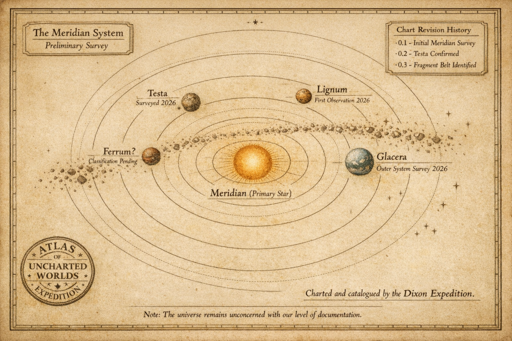 At its center lies Meridian, a quiet yellow star whose stable output appears to have allowed many small planetary bodies to survive for immense spans of time. Unlike younger systems dominated by large gas giants, the Meridian System is populated primarily by minor worlds, fragments, and geological remnants.